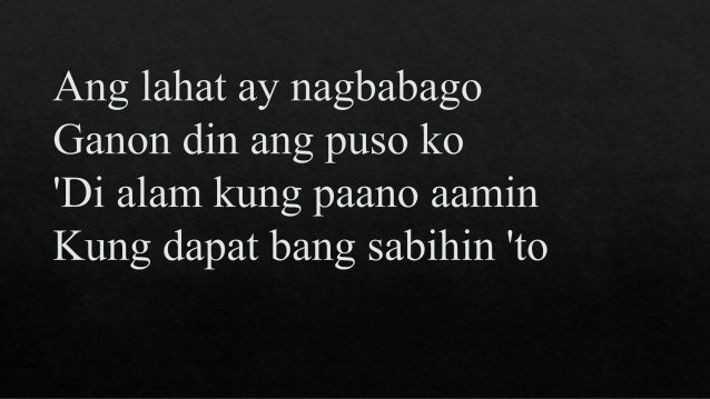 Dapat din ninyong tawagan ang isa sa mga serbisyo ng pagpapayo o pansuporta. Kung dapat bang sabihin to Pre-Chorus 1 Ngunit kailangan nang tapangan. Verse 1 Ang lahat ay nagbabago Ganun din ang puso ko Di alam kung paano aamin Kung dapat bang sabihin to Pre-Chorus 1 Ngunit kailangan nang tapangan At sabihin ang nararapat Na hindi na nga.