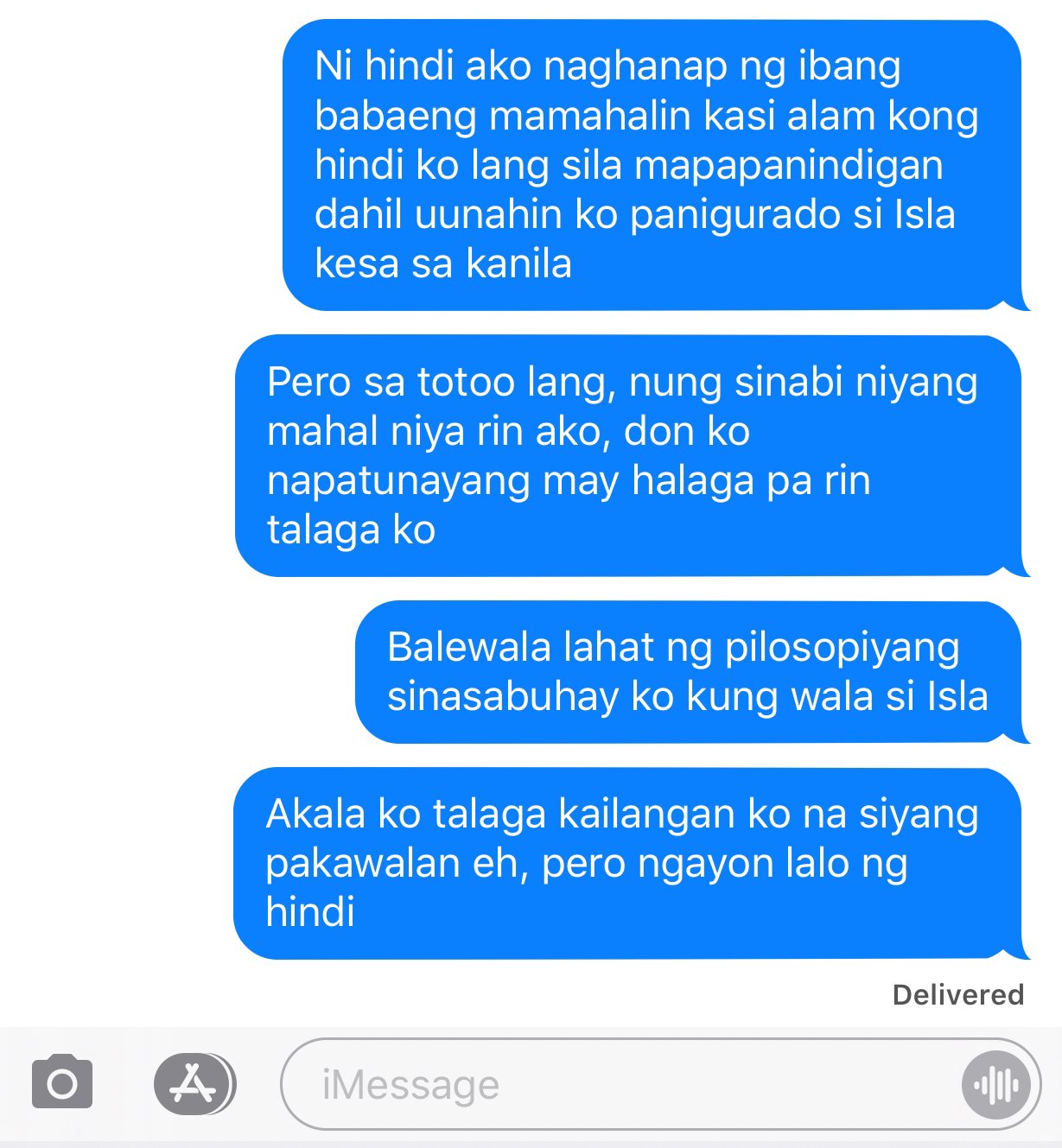 Nakilala ko siya sa gc na kung saan parang siya ang nangligaw sakin siya unang nag tapat na gusto nya ako na tipong iniiyakan nya ako palagi hindi ko alam kung dinadaan nya lang sa iyak. Ang pag-ibig ay nasa pagitan ng dalawang tao. Sa puntong ito ititigil ko na itoHindi ikaw yung lalaking nararapat para sa akinbuburahin ko na yung pangalan mo sa aking pusot isip.