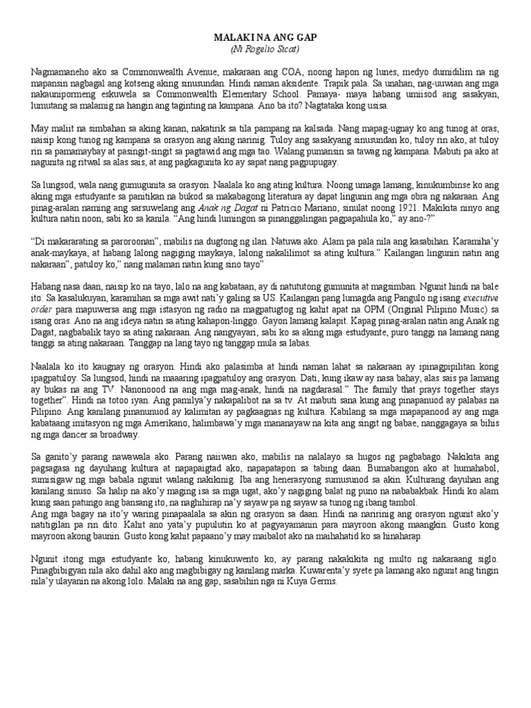 Ng mga Pilipino tayong mga Pilipino yon ang kultura natin yong magkaroon ng trabaho di ba sabi nga ng mga magulang mag-aral ka mabuti para magkaroon ka ng magandang oh di ba hindi sa mo lang masasabi yong ano eh parang. Subalit sa kasalukuyan tila naglaho na ang kalansing ng mga tansan at kalampag ng mga lata dahil sa lakas ng tunog ng mga speaker sa computer shop. Hindi koi to sinasambit dahil lamang kailangan kong ipaglaban ang mga asignatura na ito tutol ako sa pag-aalis ng mg asignaturang ito dahil masyadong mayaman ang kultura ng bansa ang wika natin ang kasaysayan natin.